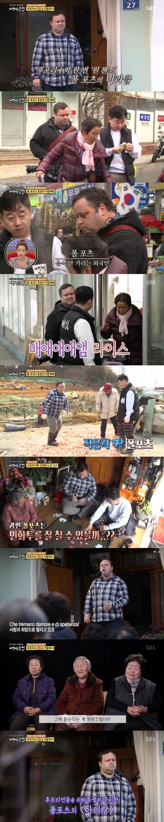 24일 오후 방송된 SBS ‘백년손님’에서는 후포리에 방문한 영국 가수 폴 포츠의 두 번째 이야기가 그려졌다.