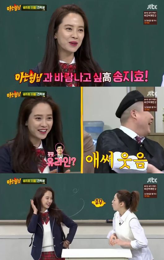 이날 송지효는 "오늘만큼은 '런닝맨'을 잊고, '아는형님'과 바람나고 싶高에서 전학왔다"면서 CG를 요청, "나랑 바람날 준비됐니?"라며 재치있게 맨트를 전했다. 이때, 송지효는 강호동을 향해 "호동이 유라인이냐"며 돌발 질문, 어디로 튈지 모르는 예능감을 보였다.