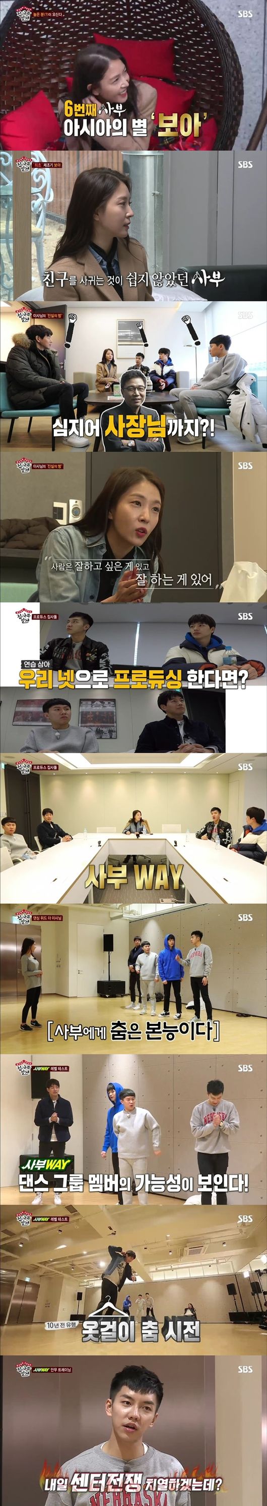 미혼 여성 사부의 등장에 환호하던 멤버들은 보아 사부와의 본격적인 하루를 위해 함께 출근길에 나섰다. 이승기가 SM에서 최연소 이사 직함을 가지고 있는 보아의 업무를 묻자 보아는 "이사마다 역할이 다르다. 저는 주로 어린 친구들이 사회생활을 하면서 적응하고 잘 소통할 수 있도록 가이드라인을 제시해주는 편”이라고 설명했다.