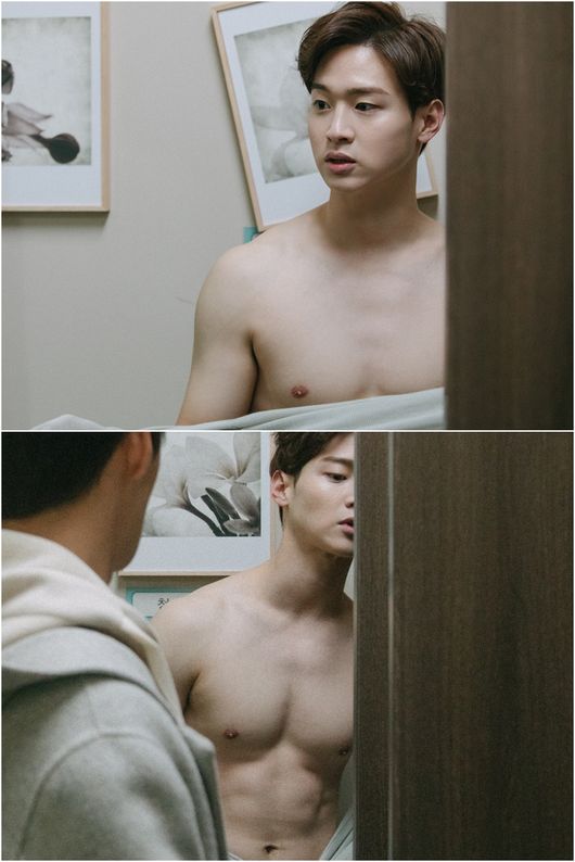 이와 관련 장동윤이 보는 것만으로도 심쿵하게 만드는 탄탄한 근육질 복근을 선보여 이목을 집중시키고 있다. 극중 실습을 끝낸 신민호가 옷을 갈아입으면서 친구인 김남우(신재하 분)에게 관리한 몸을 자랑하는 장면. 탈의실로 보이는 곳에서 윗옷을 벗은 장동윤은 자신감 넘치는 표정을 지어보이고 있다. 서글서글한 ‘베이비 페이스’ 속에 감춰졌던, 잘 잡힌 근육질 역삼각형 몸매를 드러낸 장동윤의 모습이 여심을 한껏 뒤흔들 전망이다.