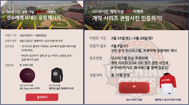 [OSEN=이선호 기자] KIA 타이거즈가 2018시즌 개막을 맞아 홈페이지와 SNS(트위터/인스타그램) 이벤트를 실시한다.