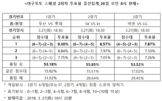 KBO 3경기 대상 야구토토 스페셜 2회차 투표율 중간집계