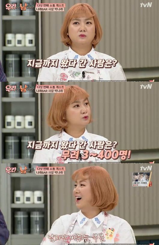박명수는 "실제로 나래BAR 많이 오냐"며 몇명이 왔었냐고 질문, 나래는 "3~400명 정도된다, 남녀 철저하게 짝을 맞춘다"고 덧붙여 놀라움을 안겼다.