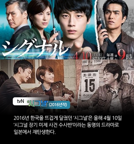 2016년 한국을 뜨겁게 달궜던 ‘시그널’은 올해 4월 10일 ‘시그널 장기 미제 사건 수사반’이라는 동명의 드라마로 일본에서 재탄생한다. 김혜수, 조진웅, 이제훈 등 충무로 스타들을 브라운관으로 불러들인 힘있는 스토리는 싱크로율 높은 캐스팅으로 재현됐다. 특히 일본의 라이징스타 사카구치 켄타로의 첫 주연작이라는 점에서 현지에서 관심도가 높은 상태다.