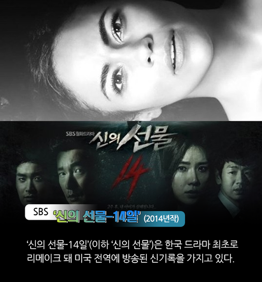 ‘신의 선물-14일’(이하 ‘신의 선물’)은 한국 드라마 최초로 리메이크 돼 미국 전역에 방송된 신기록을 가지고 있다. 사랑하는 아이를 되살리기 위해 시간 여행을 떠나는 엄마의 이야기를 그린 ‘신의 선물’은 ‘썸웨어 비트윈(Somewhere Between)’이란 이름으로 리메이크돼 2017년 6월 방송됐다. 박진감 넘치는 스토리 전개가 ‘한국 최초 미국 리메이크’라는 쾌거를 올린 결정적 요인이었다.