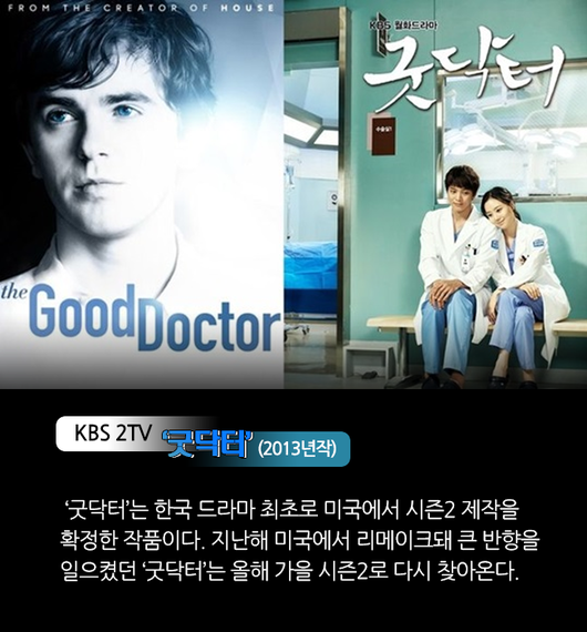 ‘신의 선물’이 한국 최초 미국 리메이크 작품이라면, ‘굿닥터’는 한국 드라마 최초로 미국에서 시즌2 제작을 확정한 작품이다. 지난해 미국에서 리메이크돼 큰 반향을 일으켰던 ‘굿닥터’는 올해 가을 시즌2로 다시 찾아온다. ‘굿닥터’에 담긴 포용의 메시지가 시청자들에게 반향을 일으켰다는 게 시즌2 제작 확정 이유다. 시청률 면에서도 ABC채널 전체 드라마 중 2위를 차지할 정도로 좋은 성과를 냈다.