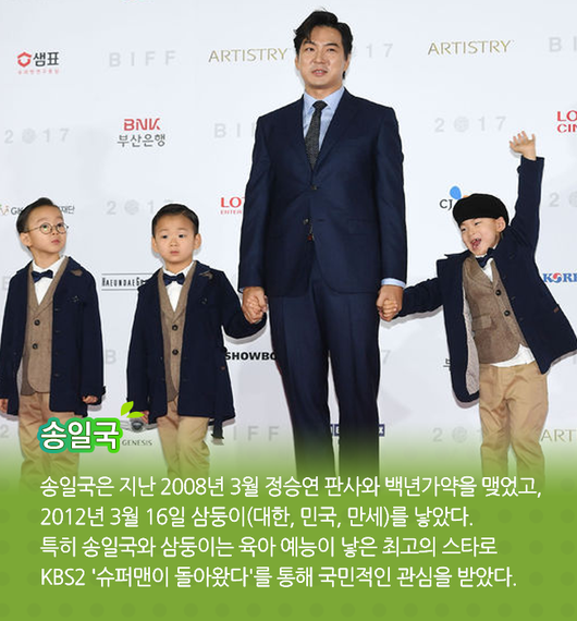 송일국은 지난 2008년 3월 정승연 판사와 백년가약을 맺었고, 2012년 3월 16일 삼둥이(대한, 민국, 만세)를 낳았다. 특히 송일국와 삼둥이는 육아 예능이 낳은 최고의 스타로 KBS2 '슈퍼맨이 돌아왔다'를 통해 국민적인 관심을 받았다. 지난해 삼둥이는 해외 연수를 떠난 엄마 정승연 판사를 따라 출국해 프랑스 파리에서 지내고 있다.