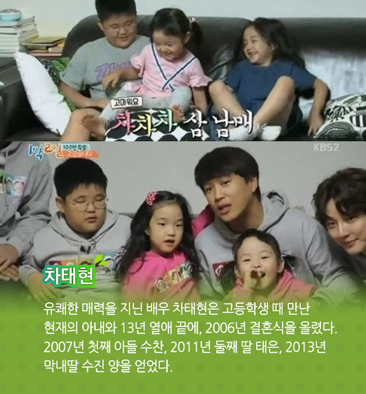 유쾌한 매력을 지닌 배우 차태현은 고등학생 때 만난 현재의 아내와 13년 열애 끝에, 2006년 결혼식을 올렸다. 2007년 첫째 아들 수찬, 2011년 둘째 딸 태은, 2013년 막내딸 수진 양을 얻었다. 평소 육아에 적극적이고 가정적이라고 알려진 차태현은 삼남매와 함께 KBS2 '1박2일'에도 출연했으며, 어린 딸을 살뜰하게 챙기는 모습이 주목을 받았다.