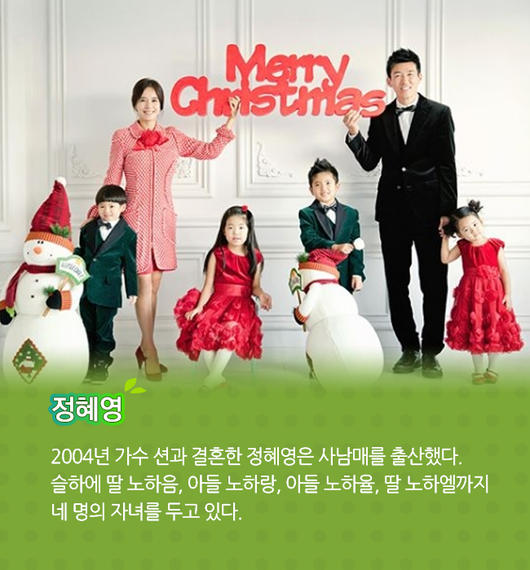 지난 2004년 가수 션과 결혼한 정혜영은 사남매를 출산했다. 슬하에 딸 노하음, 아들 노하랑, 아들 노하율, 딸 노하엘까지 네 명의 자녀를 두고 있다. 션과 정혜영은 사남매와 함께 기부를 진행하는 등 좋은 일에 앞장서고 있다. 사랑이 넘치는 화목한 모습으로 부러움을 자아낸다.