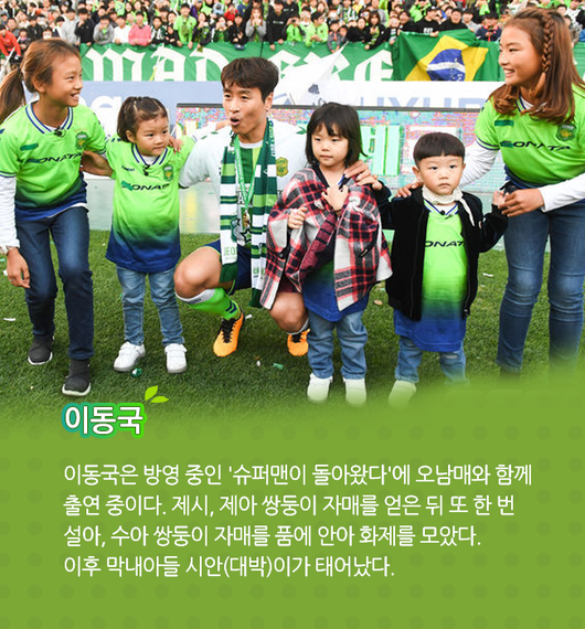 이동국은 방영 중인 '슈퍼맨이 돌아왔다'에 오남매와 함께 출연 중이다. 제시, 제아 쌍둥이 자매를 얻은 뒤 또 한 번 설아, 수아 쌍둥이 자매를 품에 안아 화제를 모았다. 이후 막내아들 시안(대박)이가 태어났다. '좌충우돌' 설수대(설아, 수아, 대박) 삼남매는 '슈돌'에서 큰 사랑을 받고 있다.