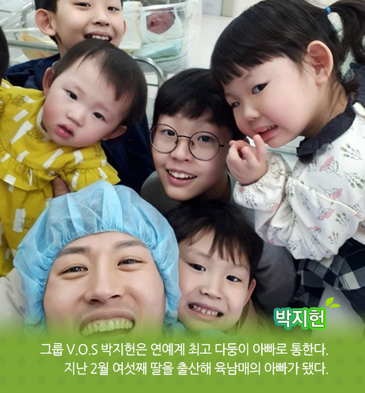 그룹 V.O.S 박지헌은 연예계 최고 다둥이 아빠로 통한다. 동갑내기 일반인 아내와 2010년 혼인신고 후, 2014년 늦은 결혼식을 올렸다. 지난 2월 여섯째 딸을 출산해 육남매의 아빠가 됐다. 현재 육아 과정을 채널A '아빠본색'을 통해 공개하고 있으며, '다둥이 아빠 대표'로 선정돼 문재인 대통령과 통화를 하기도 했다./hsjssu@osen.co.kr