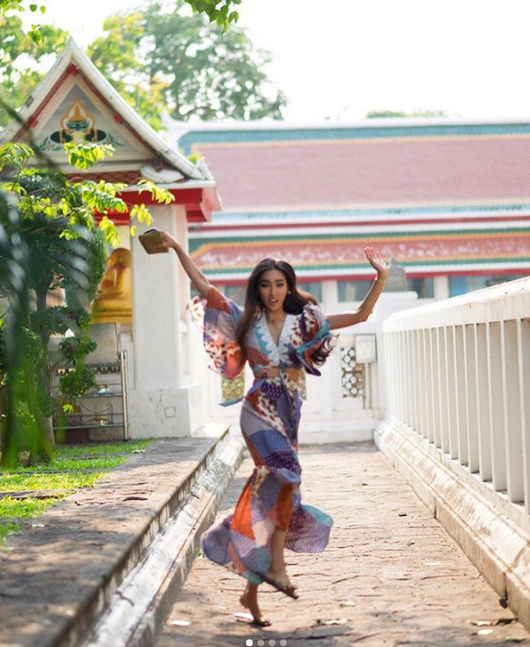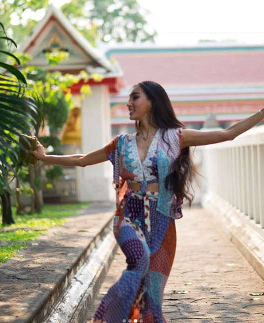 공개된 사진 속 문가비는 기분이 좋은 듯 신나게 폴짝폴짝 뛰고 있는 모습이다. 늘씬한 몸매가 부각되는 독특한 의상이 인상적.