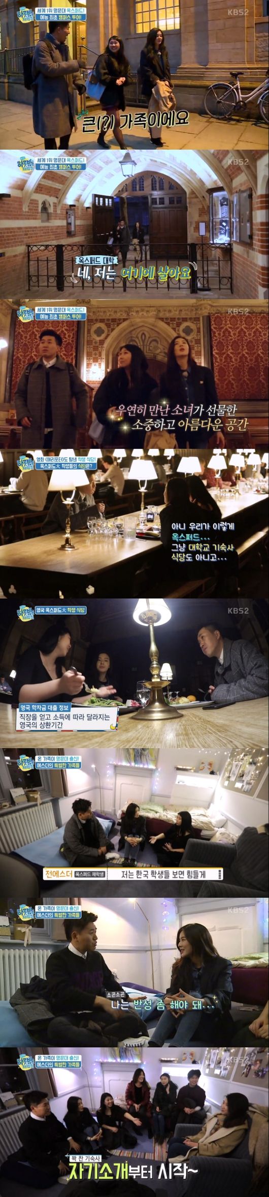 이날 방송에서는 한국 예능 최초로 영국 옥스퍼드 대학교 캠퍼스 내부의 모습이 공개됐다. 런던에서 기차를 타고 옥스퍼드로 이동한 김종민과 이선빈은 하룻밤을 지내게 해줄 사람을 찾기 시작했다.