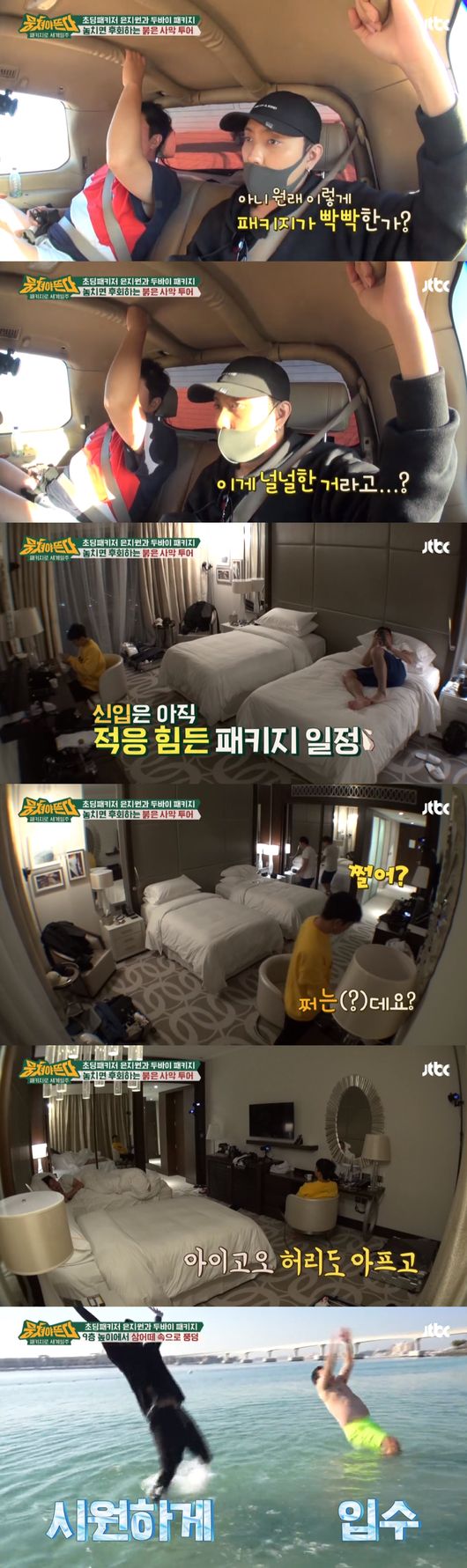 다음 날에도 은지원은 즐겁게 여행에 임했다. 워터파크에 가기 전 해변을 들렀는데 패키지 사상 처음으로 ‘잠자리 복불복’을 제안했던 은지원은 이번에 ‘입수 복불복’까지 도전했다. 과거 ‘1박2일’에서 수차례 입수하며 활약했던 은지원이 6년 만에 입수에 나선 것.