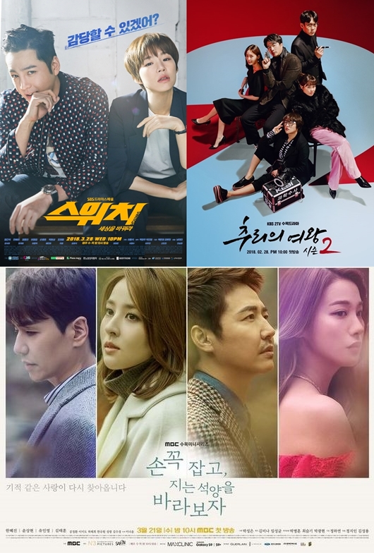 '스위치'와 동시간대 방송되고 있는 KBS 2TV '추리의 여왕2'는 뒷심 발휘를, MBC '손 꼭 잡고 지는 석양을 바라보자'는 반등의 기회를 노려보겠다는 입장이다. '추리의 여왕2'는 야심차게 시즌제를 선언했지만 시즌1에 비해 시청률도 화제성도 썩 좋지 못하다. 지난 8회 방송분은 4.7%의 시청률을 얻었다. 이제 반환점을 돌게 된 '추리의 여왕2'가 최강희 권상우 조합을 내세워 더욱 긴장감과 통쾌함이 넘치는 스토리를 전개할 수 있을지 이목이 쏠린다.