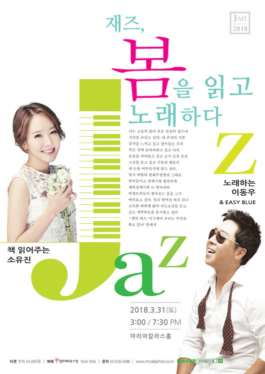 이동우와 배우 소유진이 함께 하는 ‘재즈, 봄을 읽고 노래하다’는 오는 31일 오후 3시와 7시 30분 총 2회에 걸쳐 서울 강남구 대치동에 위치한 마리아칼라스홀에서 펼쳐지며, 봄에 어울리는 ‘책과 재즈’를 주제로 관객들과 가깝게 소통할 예정이어서 높은 관심이 기대된다.