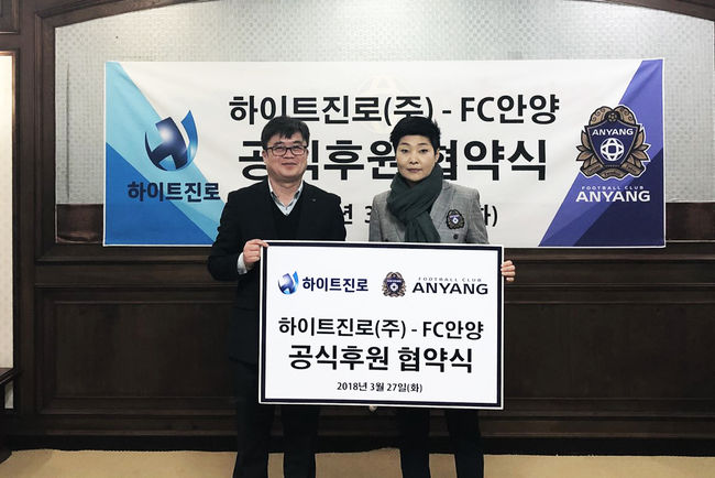 하이트진로와 안양의 후원 협약이 지난 27일 오후 임은주 안양 단장, 이민호 하이트진로 특판경기서부지점장 등 양 사 관계자들이 참석한 가운데 진행됐다. 지난 2014년부터 안양과 함께한 하이트진로는 올해로 5년째 안양을 후원하게 됐다.