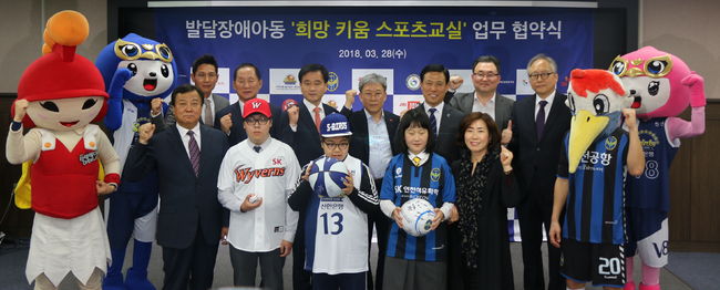 인천축구전용경기장 내 브리핑룸에서 진행된 ‘SK와 함께 하는 희망 키움 야구교실’(이하 희망 키움 야구교실) 협약식에는 SK인천석유화학, 인천서구 장애인종합복지관, 인천 재능대학교, SK와이번스 등이 참여했다.