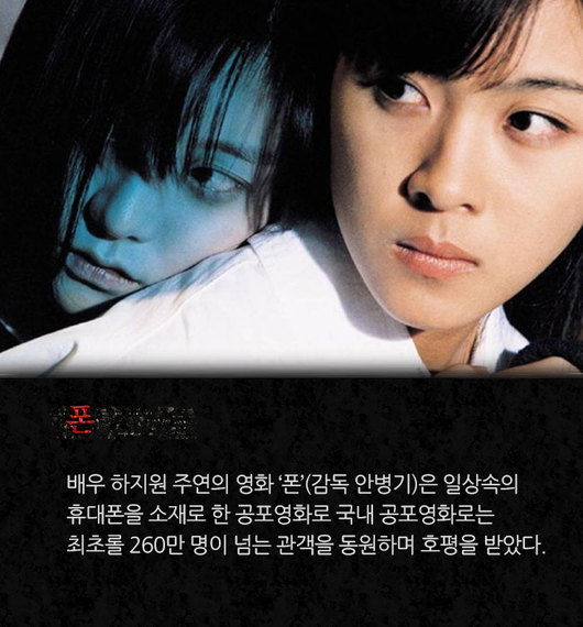 배우 하지원 주연의 영화 ‘폰’(감독 안병기)은 일상속의 휴대폰을 소재로 한 공포영화로 국내 공포영화로는 최초롤 260만 명이 넘는 관객을 동원하며 호평을 받았다. ‘가위’에 이어 ‘폰’에 출연한 하지원은 알 수 없는 미스터리한 사건에 접근하면서 겪게 되는 공포감을 관객들에게 생생하게 전달하며 관객들에게 제대로 눈도장을 찍었다.