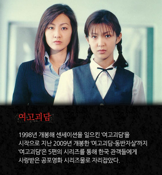 한국 공포물 중 가장 유명하고 오래된 시리즈는 단연 ‘여고괴담’이다. 지난 1998년 개봉해 센세이션을 일으킨 ‘여고괴담’을 시작으로 지난 2009년 개봉한 ‘여고괴담-동반자살’까지 ‘여고괴담’은 5편의 시리즈를 통해 한국 관객들에게 사랑받은 공포영화 시리즈물로 자리잡았다. 또한 ‘여고괴담’ 시리즈는 신인 배우의 등용문으로 불릴 만큼 이미연, 최강희, 공효진, 박한별, 송지효, 김옥빈 등 수많은 스타들을 배출해냈다. /mk3244@osen.co.kr