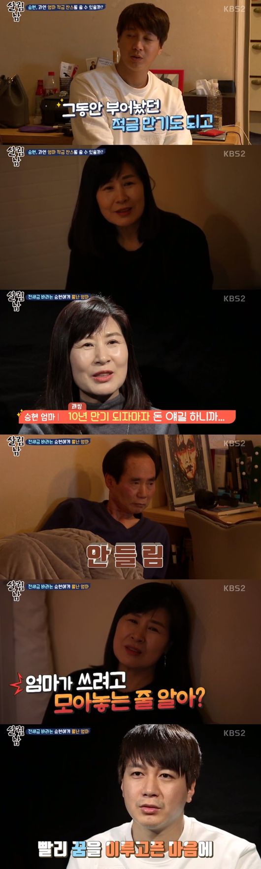 김승현은 부모님이 집으로 가려고 하자 다급하게 붙잡았다. 이어 머뭇거리며 지금 살고 있는 보증금 5천에 모아둔 돈이 5천만원이라며 돈을 보태달라고 했다. 김승현은 "조금만 보태주시면"이라고 어렵게 말을 꺼냈다.