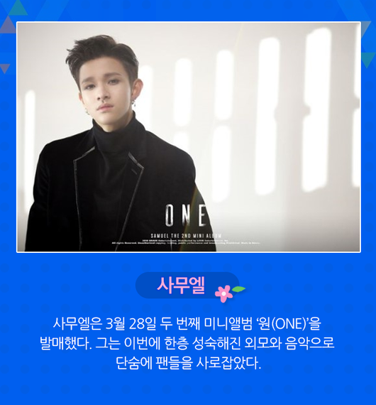 사무엘은 3월 28일 두 번째 미니앨범 ‘원(ONE)’을 발매했다. 그는 이번에 한층 성숙해진 외모와 음악으로 단숨에 팬들을 사로잡았다. 타이틀곡 ‘ONE'은 용감한 형제를 필두로 JS, 차쿤이 공동작업했으며 일렉트로 하우스 장르 기반의 댄스곡이다. 사무엘의 파워풀하면서도 호소력 짙은 목소리를 고스란히 느낄 수 있다. 여기에 비투비 정일훈이 피처링으로 참여해 곡의 퀄리티를 높였다.