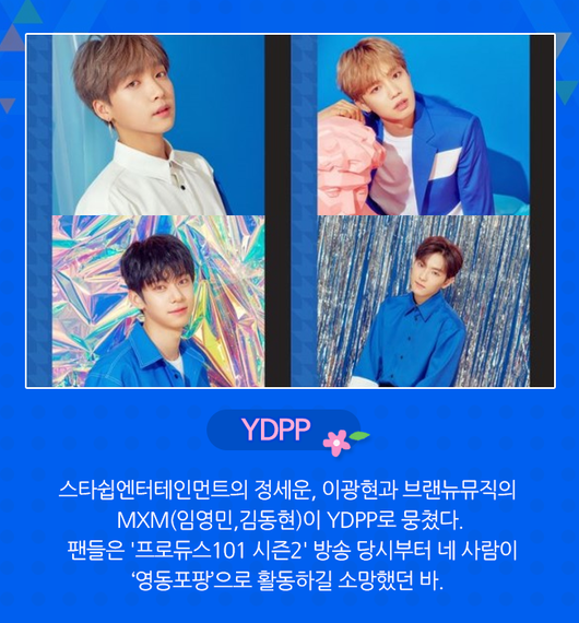 스타쉽엔터테인먼트의 정세운, 이광현과 브랜뉴뮤직의 MXM(임영민,김동현)이 YDPP로 뭉쳤다. YDPP는 5일 신곡 ‘LOVE IT LIVE IT'을 발표하고 본격적인 프로젝트 그룹 활동에 돌입했다. YDPP는 ‘YOUTH, DREAM, PASSION, PURITY’로 4인의 멤버들이 추구하는 음악적 색을 담은 단어들의 이니셜로 명명됐다. 팬들은 '프로듀스101 시즌2' 방송 당시부터 네 사람이 ‘영동포팡’으로 활동하길 소망했던 바. 정세운은 지난해 솔로로 데뷔해 대세 행보를 걸은데다 MXM도 톡톡한 활약을 펼친 만큼 YDPP도 많은 관심을 받고 있다.
