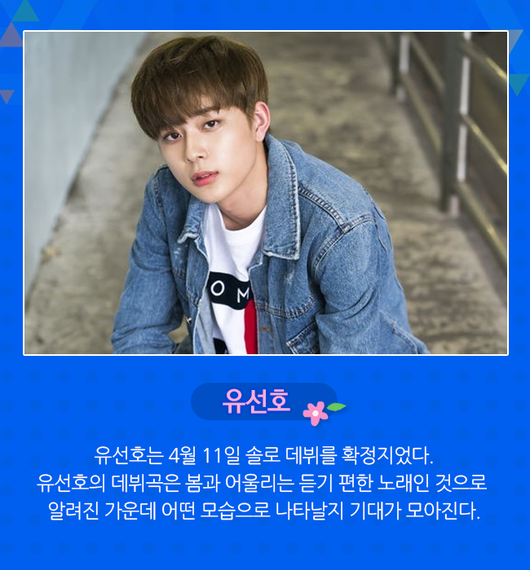 유선호는 4월 11일 솔로 데뷔를 확정지었다. 그는 '프로듀스101 시즌2' 출연 당시 6개월차 연습생으로 시작했음에도 불구하고 최종 17위에 올라 실력을 인정받았다. 이후 웹드라마, 예능 등 다양하게 출연하며 대중에게 얼굴을 알렸다. 유선호의 데뷔곡은 봄과 어울리는 듣기 편한 노래인 것으로 알려진 가운데 어떤 모습으로 나타날지 기대가 모아진다.