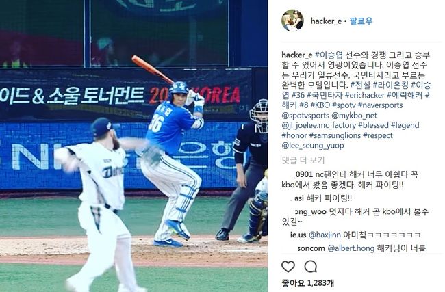 해커는 KBO리그가 개막한 지난 24일에는 KBO 개막을 축하하며 "KBO 전 동료들의 개막전 행운을 빌어요"라는 글을 올렸다. 28일에는 이승엽의 친필 사인이 담긴 이승엽 유니폼을 게재하기도 했다. “이승엽 선수와 경쟁 그리고 승부할 수 있어서 영광이었다. 이승엽 선수는 우리가 일류선수, 국민타자라고 부르는 완벽한 모델”이라고 글을 남겼다.