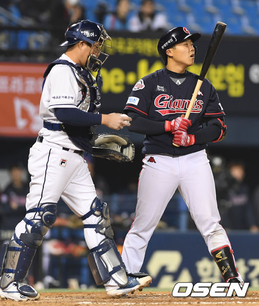 김강률의 초구 145km 높은 속구에 힘차게 배트를 돌렸지만 헛스윙, 2구 143km의 속구에도 다시 한 번 헛스윙. 어깨에 힘이 가득 들어갔다. 그리고 3구 째 145km 바깥쪽 속구는 그대로 바라봤다. 루킹 삼진으로 이닝과 경기 모두 종료됐다. 한동희는 그렇게 다시 한 번 속상한 표정을 지으며 고개를 떨궜다.