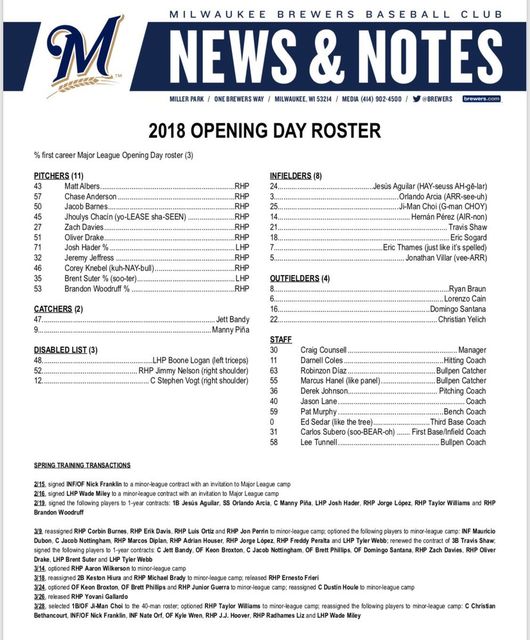 밀워키는 30일(이하 한국시간) 오전 5시10분 미국 캘리포니아주 샌디에이고 펫코파크에서 열리는 2018 메이저리그 샌디에이고 파드리스와 시즌 개막전을 하루 앞두고 개막 로스터를 최종 확정, 발표했다.