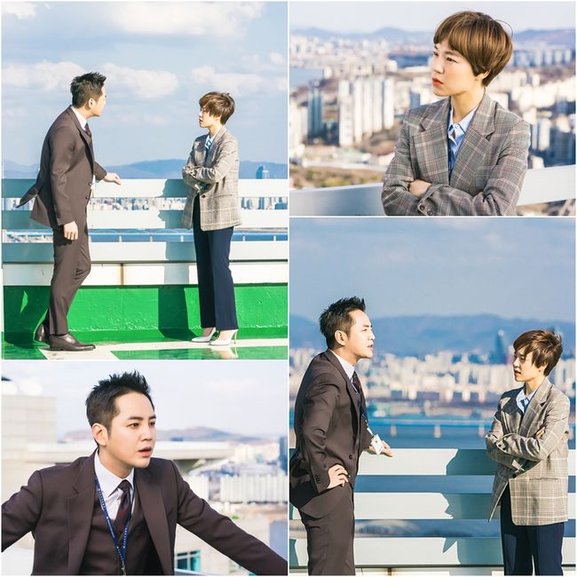 장근석과 한예리의 ‘옥상 신경전’ 장면은 지난 14일 서울 여의도에서 촬영됐다. 이날 장면 촬영 당시 꽃샘추위가 기승을 부리고 예사롭지 않은 강풍이 부는 등 날씨가 좋지 않았던 상태. 3월인데도 불구하고 두꺼운 패딩으로 중무장을 한 채 리허설을 진행한 두 사람은 시종일관 화기애애한 모드로 연습을 진행, 보는 이들을 흐뭇하게 만들었다. 뿐만 아니라 장근석의 재치 넘치는 애드리브를 한예리가 자연스럽게 받아치면서 딱딱 맞아떨어지는 ‘연기 케미’를 과시, 일사천리로 촬영을 완성했다.