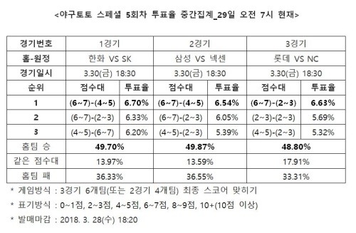 KBO 3경기 대상 야구토토 스페셜 5회차 투표율 중간집계