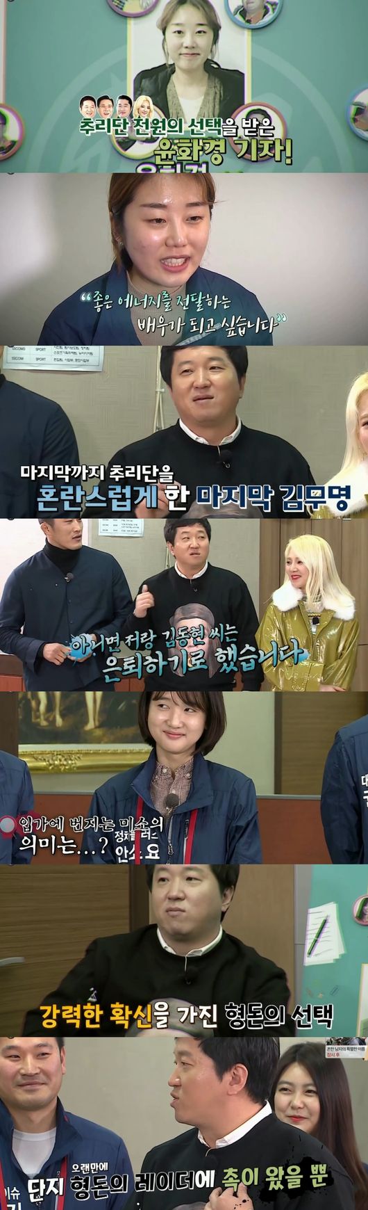 이날 추리단은 윤화경을 가짜 기자로 지목했고, 윤화경은 무명배우였다. 이어 추리단은 다른 후보를 두번째 가짜로 지목했지만 정형돈은 "이번엔 내 촉을 믿어달라"며 끝까지 안소요를 지목했다. 그는 안소요의 정체를 확인하기 전 "순전히 촉으로만 가는 거다"고 말했고, 안소요는 가짜로 드러났다. 추리단은 가짜를 두명 다 밝혀내는 성과를 거뒀다. / bonbon@osen.co.kr