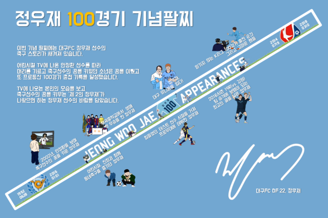대구FC가 정우재의 프로통산 100경기를 기념하는 팔찌를 공개했다. 팔찌는 오는 31일 오후 4시 대구스타디움에서 열리는 전남과 홈경기서 판매된다.
