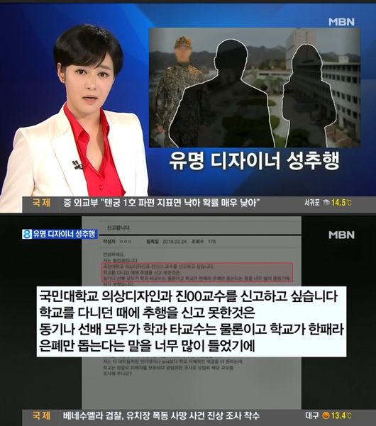 30일 방송된 MBN '뉴스8'은 "2월 24일 한 커뮤니티에 국민대학교 의상디자인과 진 모 교수에게 성추행 당했다는 폭로글이 올라왔다"고 보도했다.