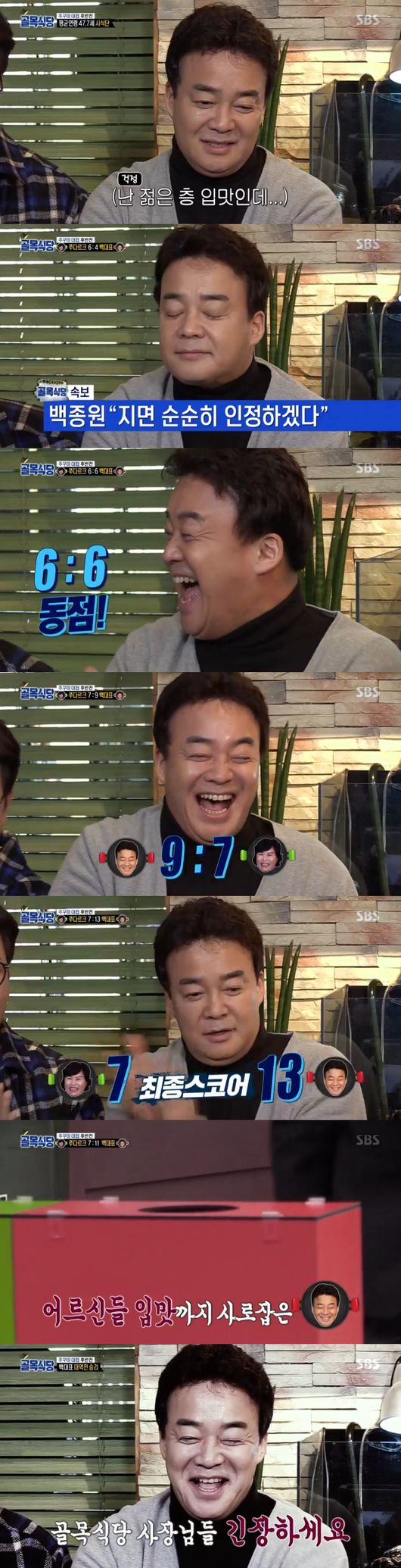 백종원은 "내가 연령층 있는 분들한테 맞나? 진짜 포기했는데"라며 어리둥절, 이때 백종원이 연속 4표 몰표로 역전했다. 어르신 입맛까지 사로잡은 백종원은 "눈물 나려한다, 개망신 당할 뻔했다"며 13대7로 전세역전해 기뻐했다. 그럼에도 백종원은 "언젠간 지겠쥬"라며 겸손한 모습도 잊지 않았다.