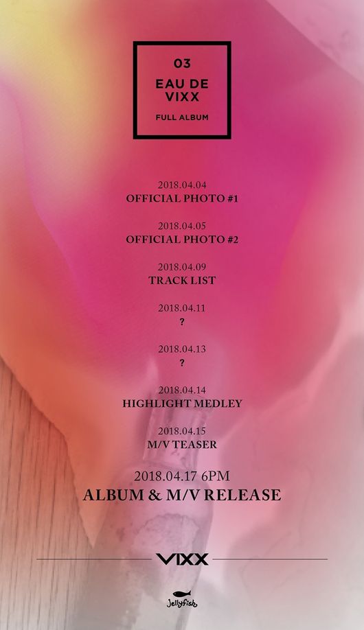 이번 공식 스케줄러에는 정규 3집 앨범 ‘EAU DE VIXX(오 드 빅스)’가 발매되는 내달 17일 전까지 오피셜 포토 연속 공개를 비롯해 앨범의 흐름을 알 수 있는 트랙리스트와 하이라이트 메들리를 순차적으로 공개한다. 4월 15일에는 뮤직비디오 티저 버전을 공개하며 컴백 기대감을 최고조로 높일 예정이다.