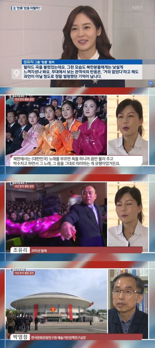 31일 방송된 KBS 1TV '남북의 창'에서 성유리는 "공연을 준비하면서 노출이 심한 의상은 자제하고 안무도 크지 않은 무대로 부탁받았다"고 말했다.