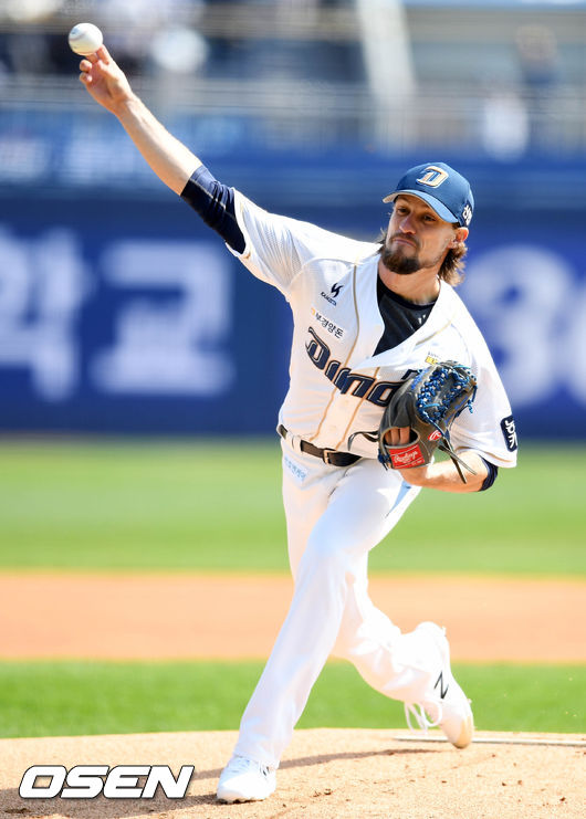 NC 다이노스 로건 베렛이 첫 등판에 비해서는 아쉬운 성적을 남겼지만 타선의 도움으로 승리 조건을 갖추고 마운드를 내려왔다.