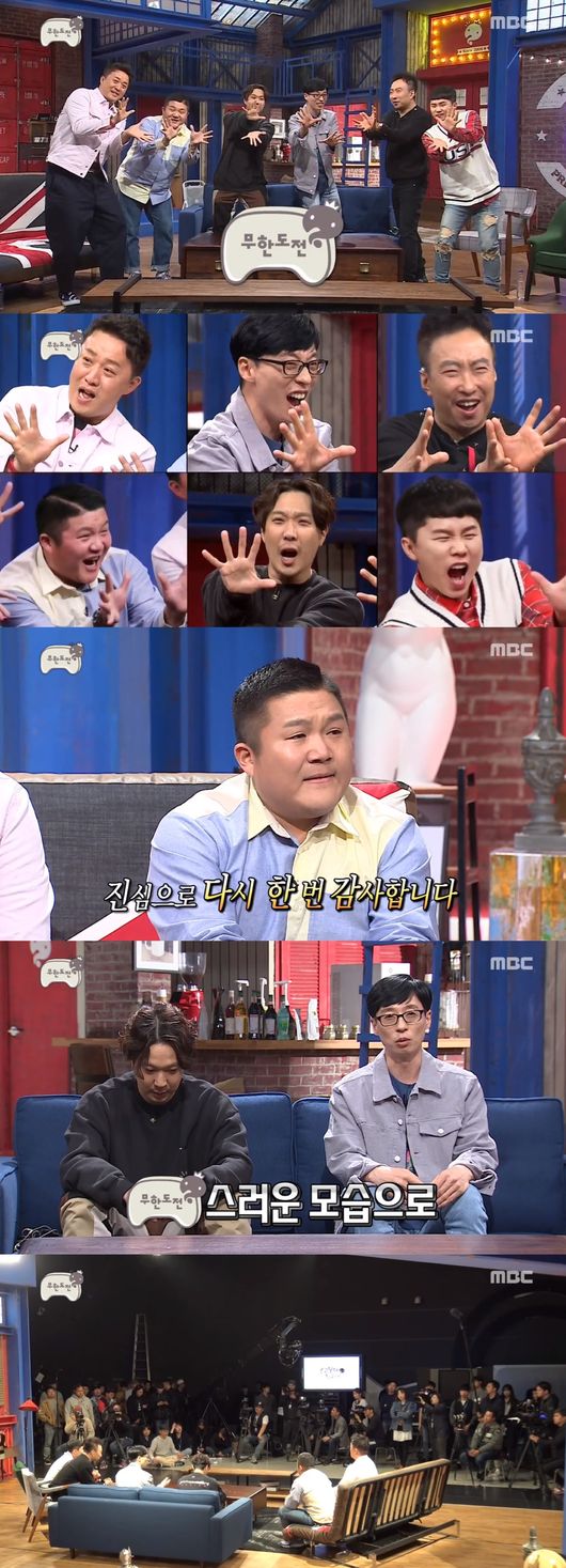 박명수는 “내가 이렇게 살 수 있었던 게 ‘무한도전’이 가장 컸다. 끝날 때 되니까 ‘왜 그때 열심히 안 했을까’ 이런 생각이 든다”며 후회하는 모습을 보였다. 정준하는 눈물을 흘리며 “정말 감사하다”고 했다. 하하는 “한편으론 죄송한 마음도 있다. 이렇게 키워주셔서 감사하다”며 결국 눈물을 보였다.