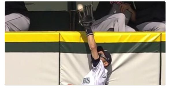 좌익수로 출장한 그는 1-4로 뒤진 3회 탄성을 자아내는 그림 같은 호수비를 펼쳤다. 클리블랜드의 호세 라미레스가 친 타구는 좌측 펜스를 넘어가는 홈런성 타구였다. 좌측 펜스로 달려간 이치로는 낙구 지점을 예상하고 펜스에 부딪히며 점프, 담장 위로 넘어가는 공을 잡아냈다. 현지 언론들은 "이치로가 홈런을 강탈했다"고 전했다.