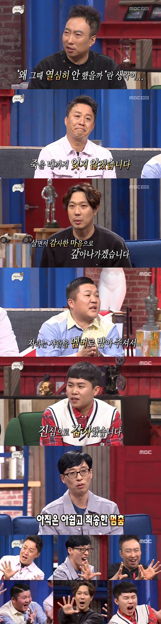 박명수는 “내가 이렇게 살 수 있었던 게 ‘무한도전’이 가장 컸다. 끝날 때 되니까 ‘왜 그때 열심히 안 했을까’ 이런 생각이 든다”며 후회했다. 정준하는 “시청자분들께 가장 감사하고, 지금까지 함께해 온 제작진, 멤버들에게 고맙다. 감사하고 고마운 마음밖에 없다. 죽을 때까지 잊지 않겠다”며 눈물을 쏟았다.