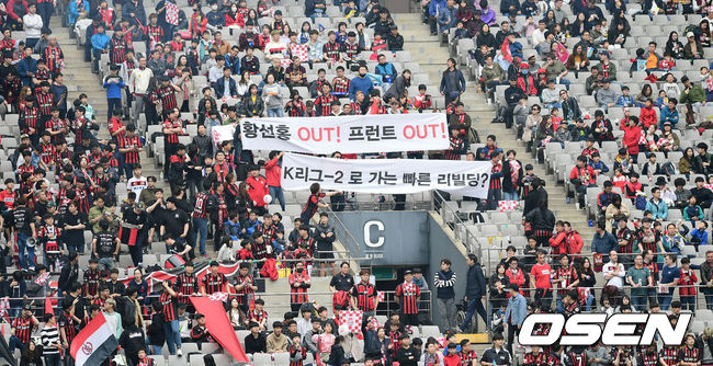 이날 '황선홍 OUT!'이라는 걸개가 걸린 것에 대해서는 "팬들의 심정을 충분히 이해한다. 굉장히 책임감을 많이 느끼고 있다. 분명하게 말하고 싶은 건 하루하루 최선을 다해서 좋은 축구를 할 수 있도록 노력할 것이다. 만족스럽지 않더라도 선수들을 믿고 기다려주시면 최선을 다해 보답하겠다"고 말했다./dolyng@osen.co.kr