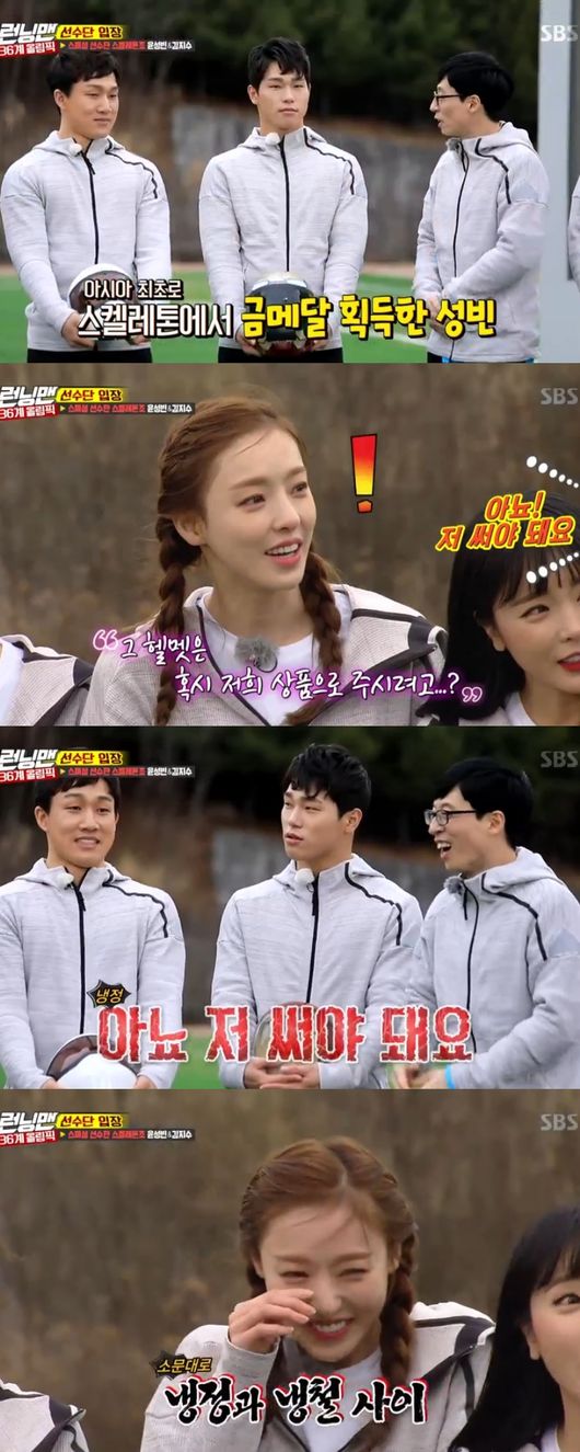 1일 방송된 SBS '런닝맨'에서는 스켈레톤 선수 윤성빈, 김지수 출연했다. 유재석은 "경기가 끝나고 윤성빈 선수가 자신의 경기를 많이 돌려봤다는데.."라고 물었다. 윤성빈은 "경기 분석을 위해 봤다"고 말했고, 김지수는 "보면서 '나 멋있지 않냐'라는 말을 했다"고 말해 웃음을 유발했다.