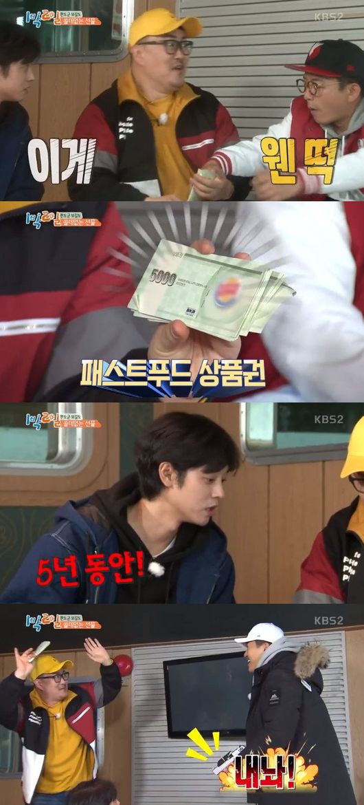'1박 2일' 정준영이 '쓸데없는 선물'로 패스트푸드 상품권을 준비했다.