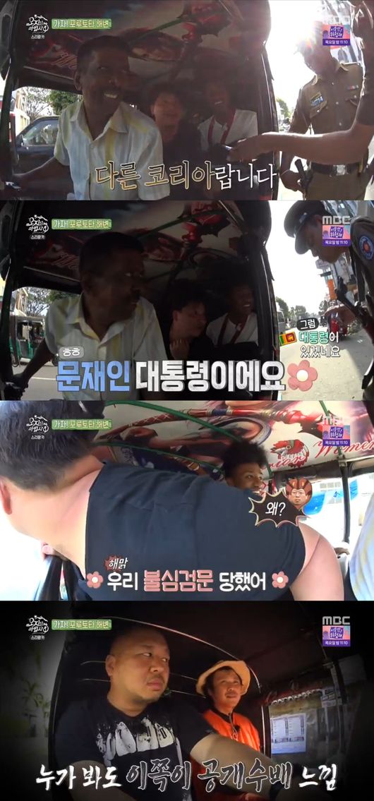 이때, 툭툭이를 세우는 스리랑카 경찰들은 한국 예능프로그램 촬영 중이란 말에 "김정은 코리아?"라고 물었다. 기습 질문에 윤정수는 당황 '노노, 우린 남쪽, 문재인 대통령이다"며 이를 정정했다.