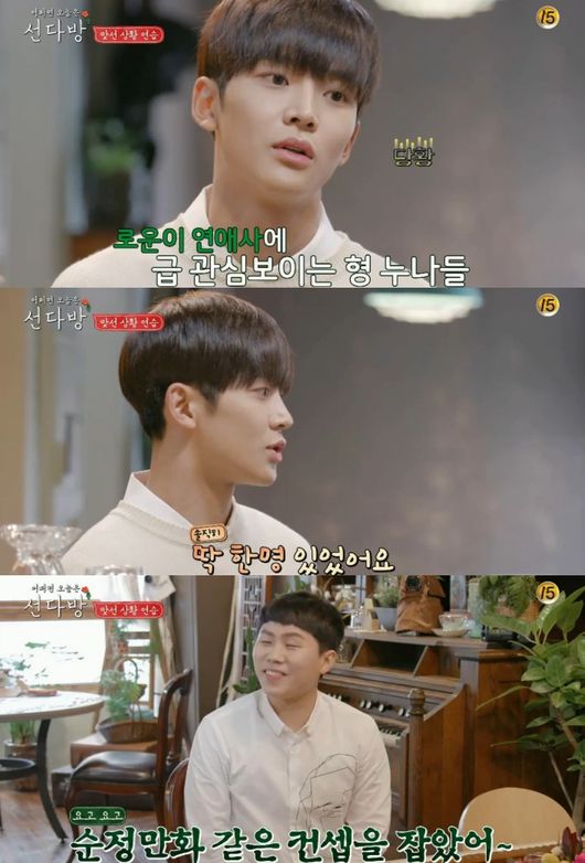 로운 역시 "소개팅 한 적 없다"고 딱딱하게 대답했다. 이에 누나 형들은 "여자 많이 만났냐"고 기습 질문, 로운은 "솔직히 딱 한명있었다, 첫사랑"이라 대답했다.