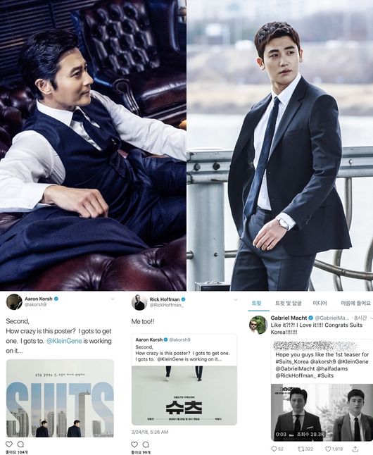 앞서 원작 NBC ‘슈츠(Suits)’의 크리에이터인 Aron Korsh는 자신의 SNS를 통해 한국판 ‘슈츠(Suits)’의 컨셉 포스터를 공개하며 “How crazy is this poster? I gots to get one. I gots to”(이 포스터는 얼마나 대단한 거야? 나도 하나 갖고 싶다)는 글을 게재하며 기대감을 드러냈다. 아직 정식 포스터가 아닌 컨셉 포스터임에도 이토록 뜨거운 기대감을 보인 것이다. 원작 ‘슈츠(Suits)’에 출연 중인 배우 릭 호프만도 이 글을 리트윗하며 “Me too!!”(나도)라고 언급해 눈길을 끌었다.