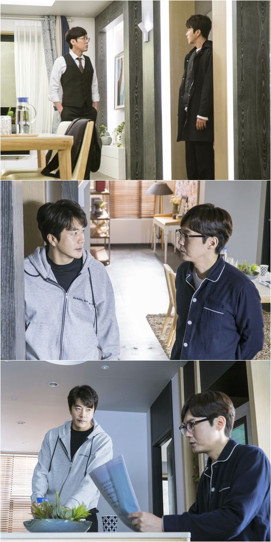 공개된 사진은 4일 방송의 한 장면으로 하완승(권상우 분)이 우 경감(박병은 분)의 집에서 함께 생활하는 뜻밖의 모습이 담겨 있다. 누가 봐도 어색하고 불편한 기색이 역력한 두 사람. 그렇기에 묘한 웃음도 자아낸다.